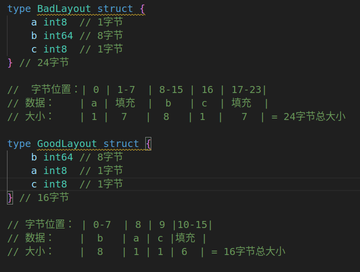 原因是还有规则 2:每个字段的起始位置必须是其类型大小的整数倍 。 BadLayout结构体中, b字段内存的起始位置必须是8的整数倍,即不能紧挨着a字段,需要填充 7 个字节,如上图。